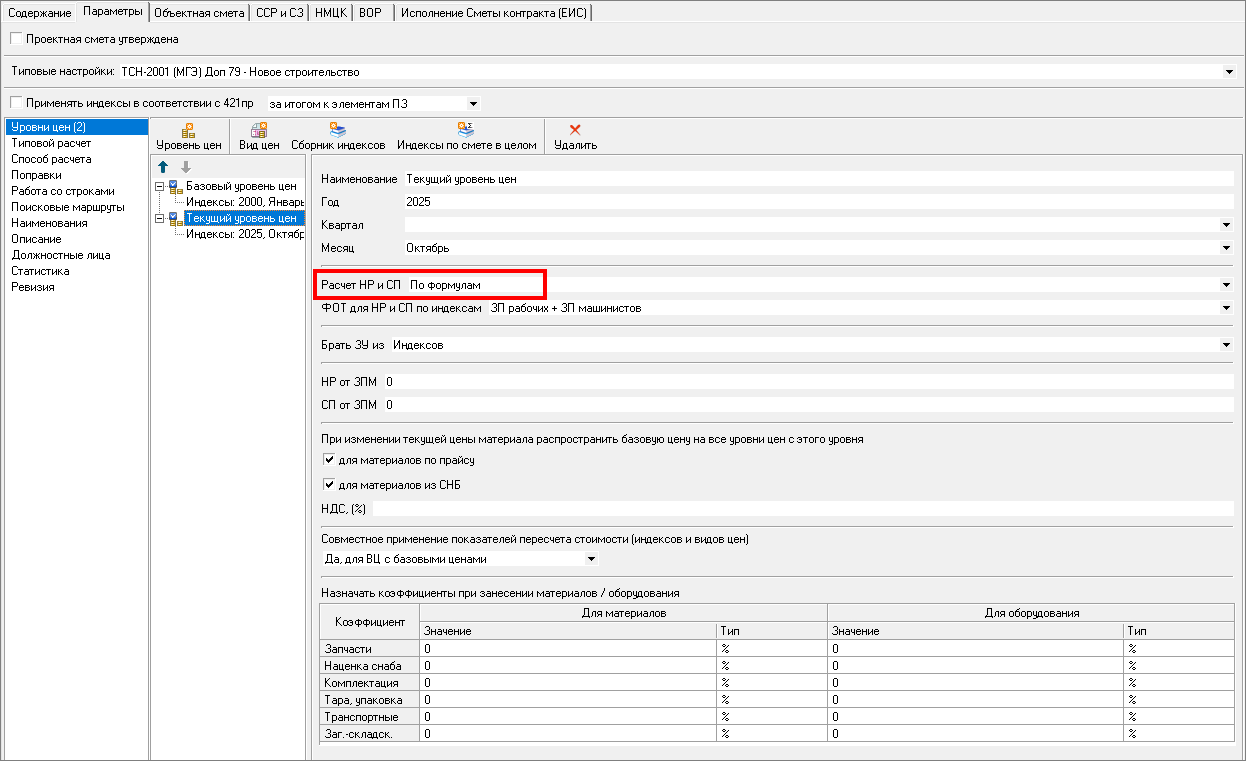 Для корректного расчета в параметрах сметы необходимо выбрать Расчет НР и СП – по формулам